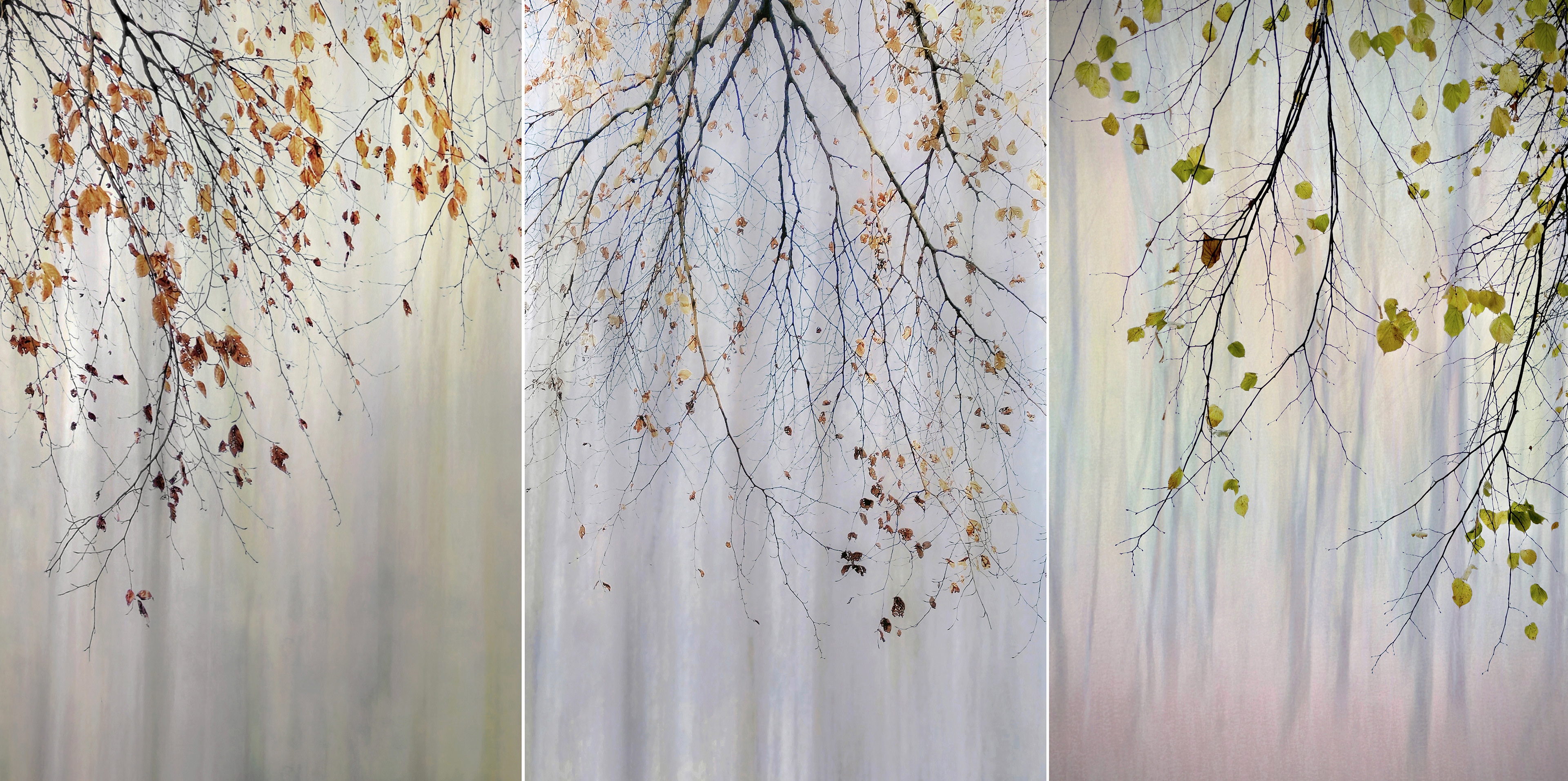 Serene and sparse forest scenes given a fine art look. The delicate interplay of light and shadow creates a dreamlike, serene atmosphere evoking fantasy and wonder.