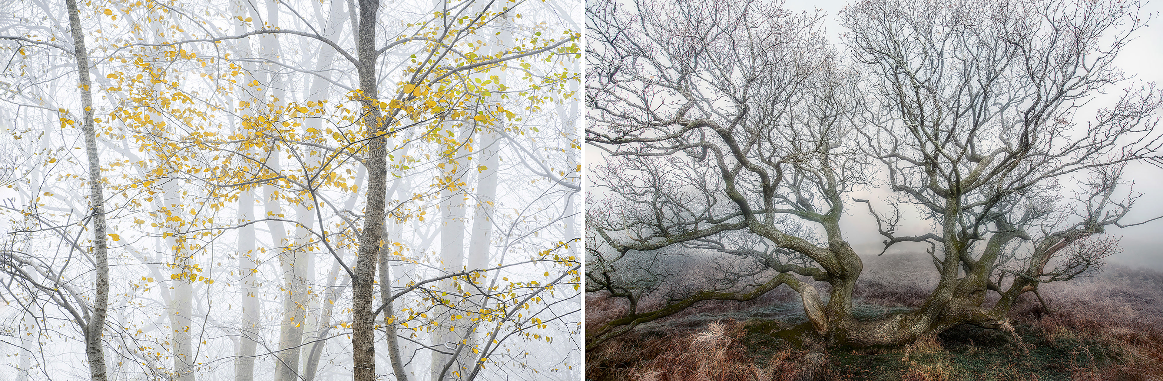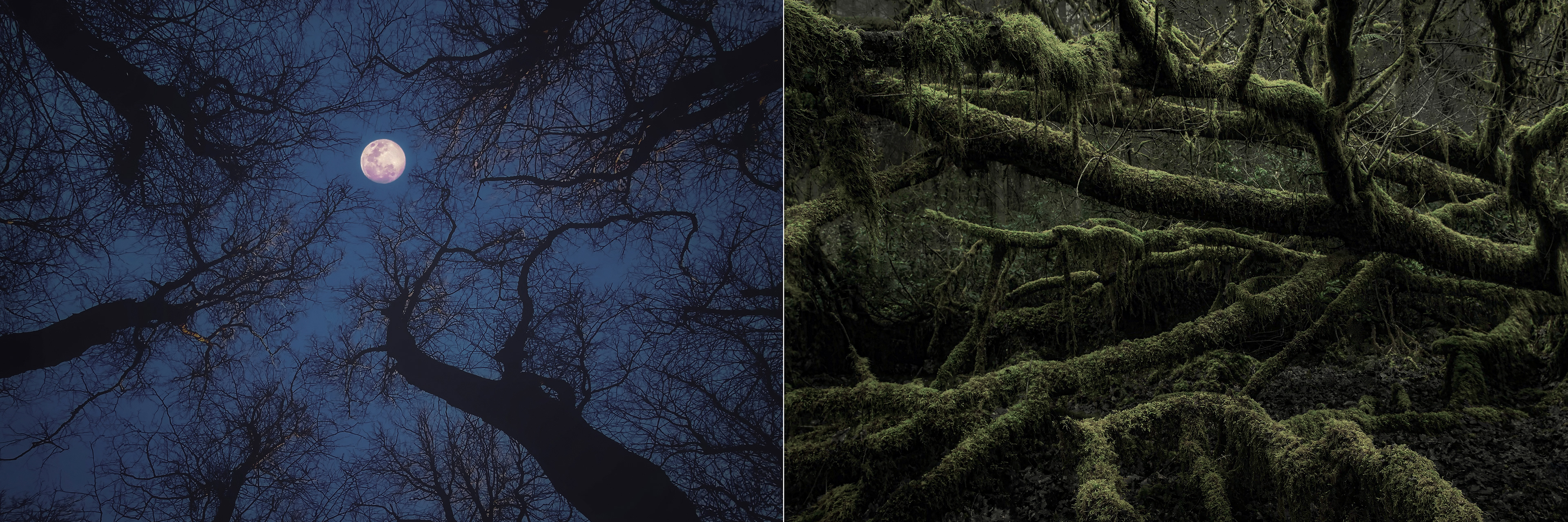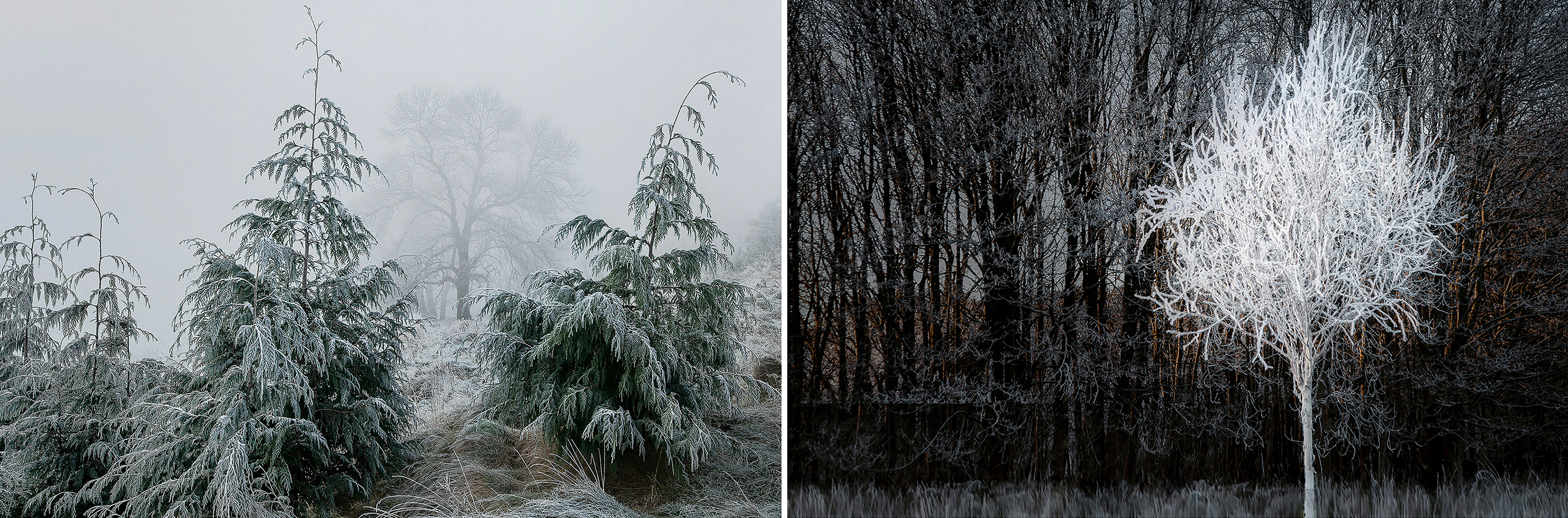 These images evoke Mother Nature's diverse beauty, showcasing twisted, ancient trees, frost-covered branches. Scenes transition from foggy forests to vibrant green foliage, highlighting nature's seasonal transformations.