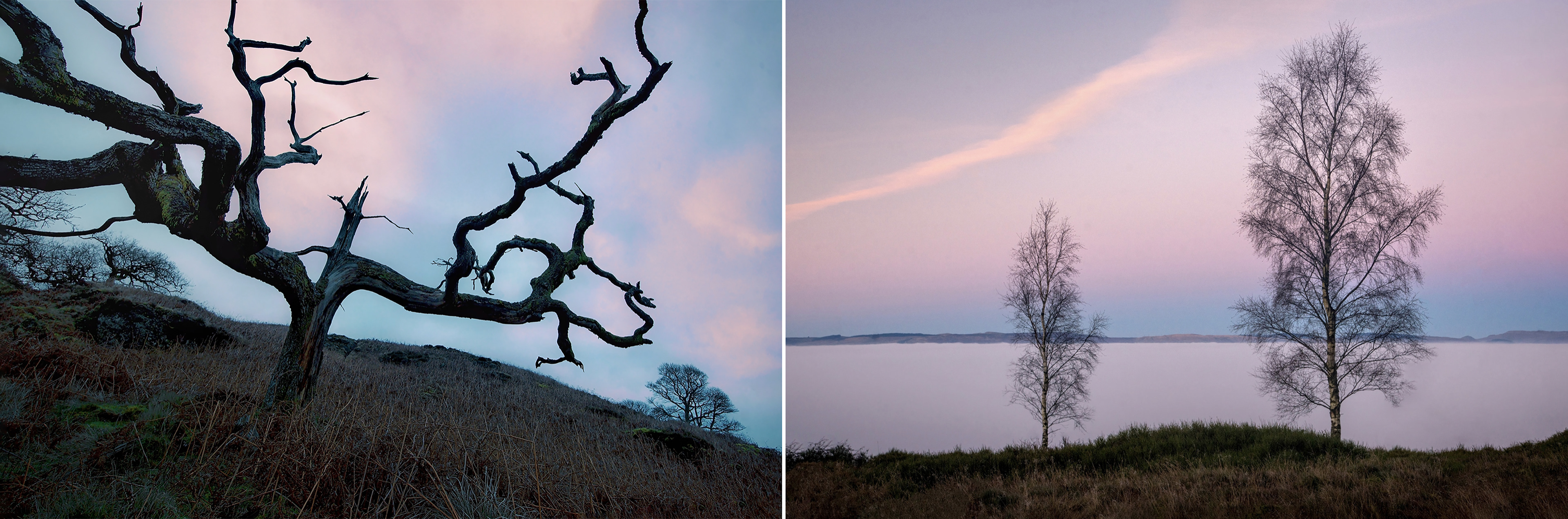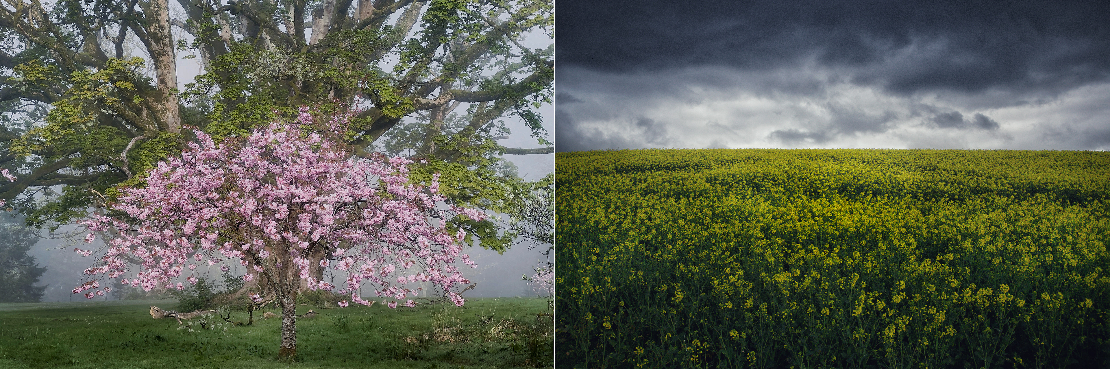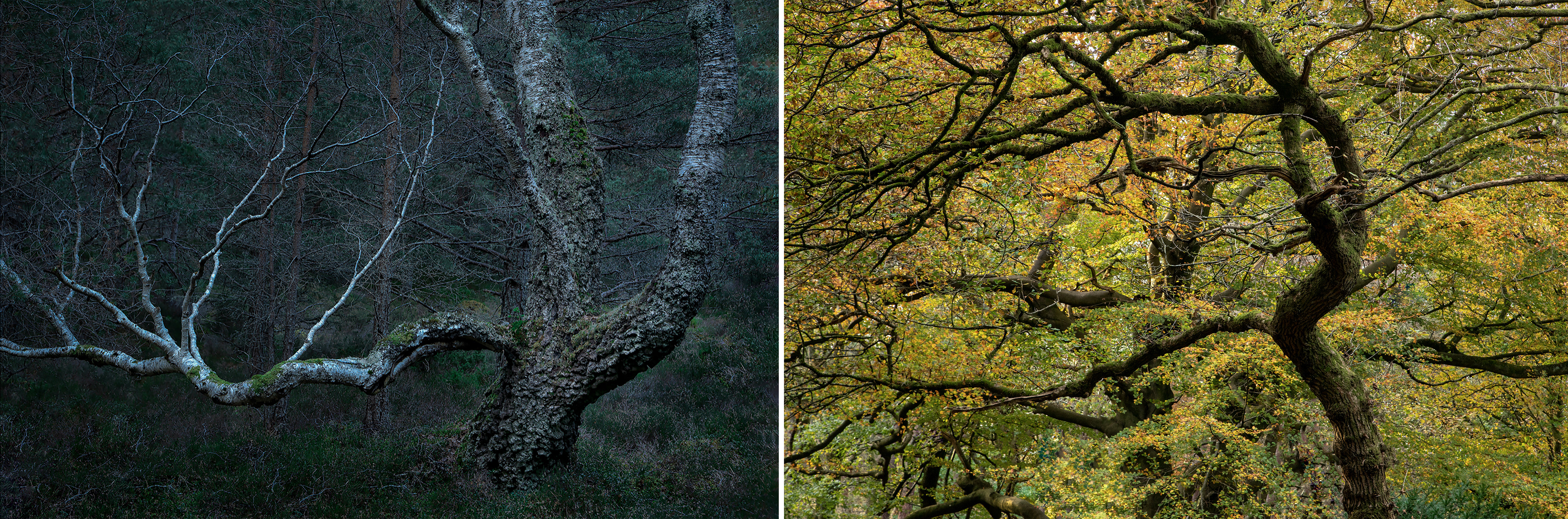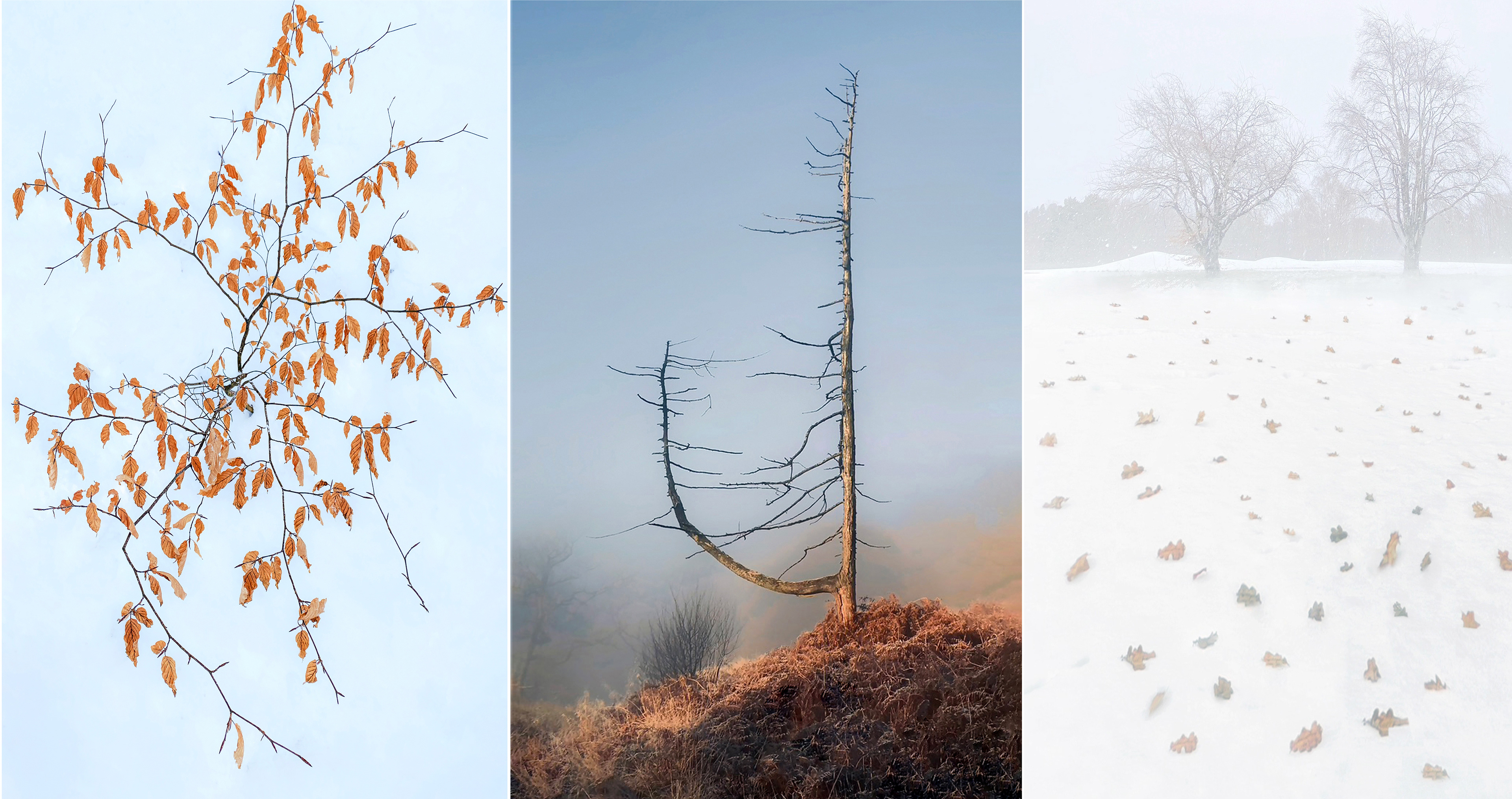 These images evoke Mother Nature's diverse beauty, showcasing twisted, ancient trees, frost-covered branches. Scenes transition from foggy forests to vibrant green foliage, highlighting nature's seasonal transformations.